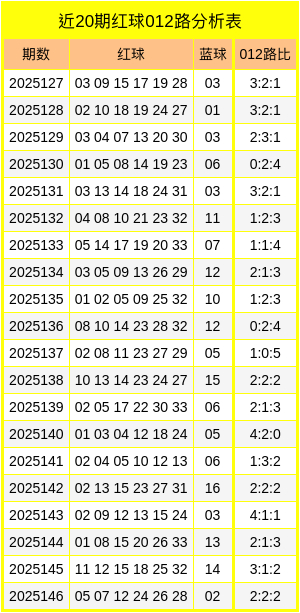 双色球第2025146期开奖,红球:05、07、12、24、26、28,蓝球:02。其中红球012路比为2:2:2,蓝球开出2路号码。